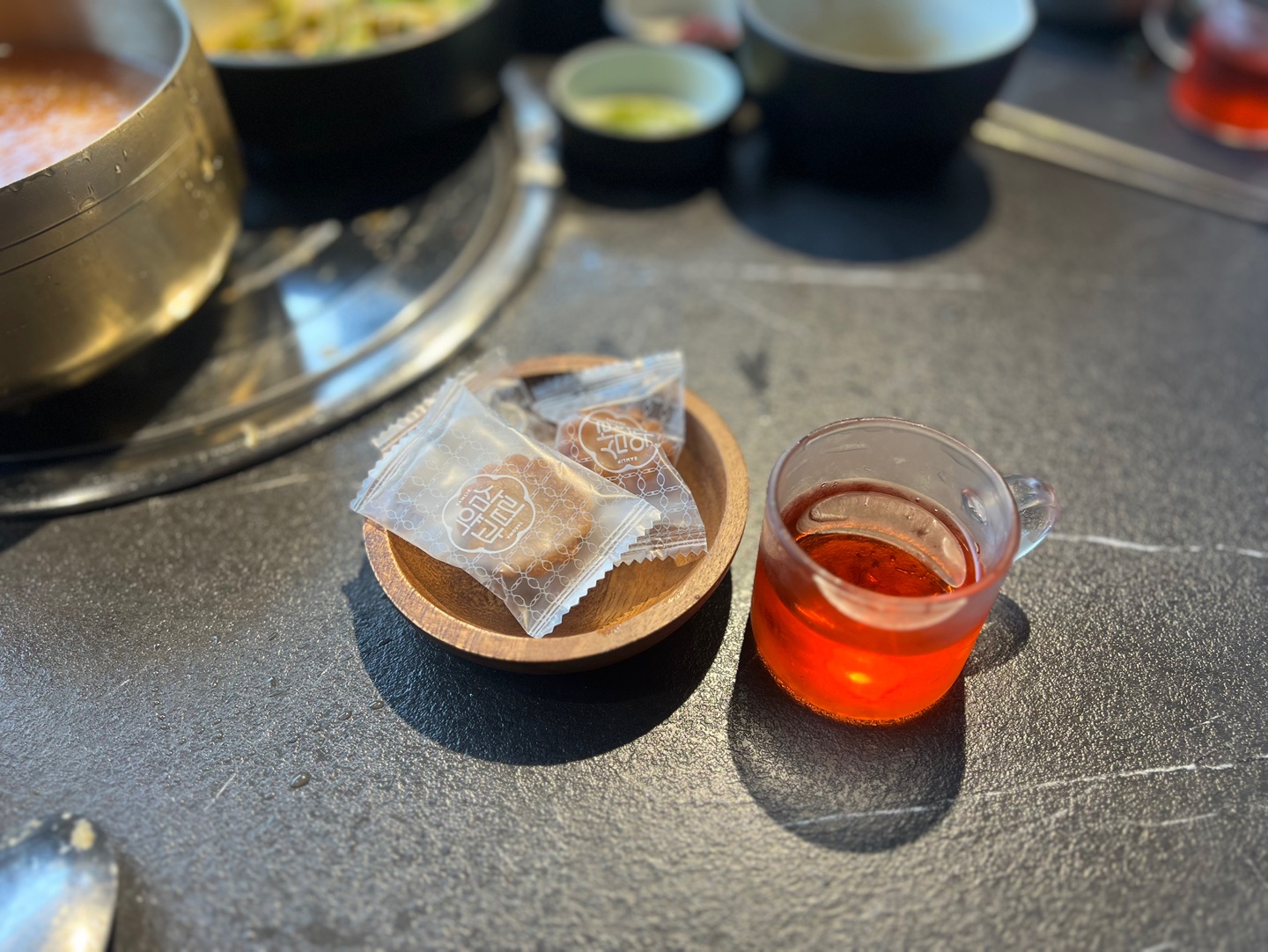 To finish: a small yakgwa (Korean honey cookie) and a glass of omija tea.