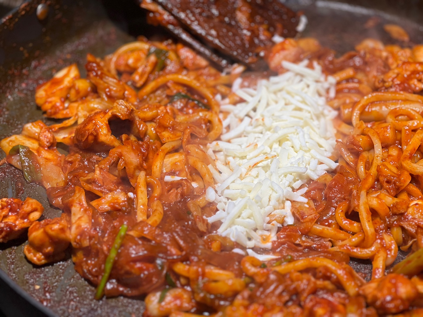 As the chicken sizzled with cabbage, leeks, chewy rice cakes, and glass noodles,