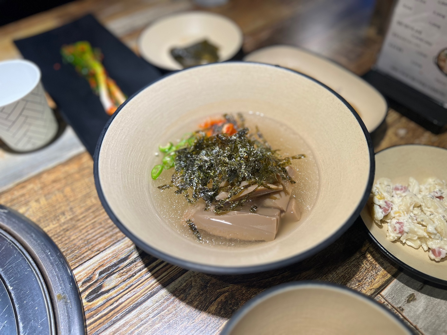 The standout? Mool-muk (cold acorn jelly soup) — topped with cucumber, seaweed, and crushed ice.
