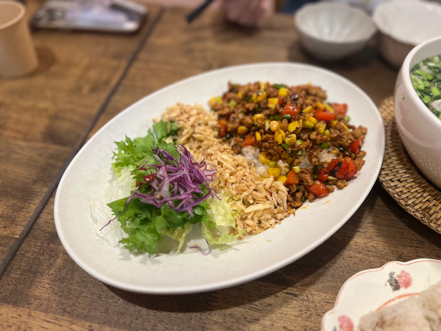 The pork was minced and sautéed with garlic stems, corn, and bell pepper over rice, with a fresh salad on the side.
